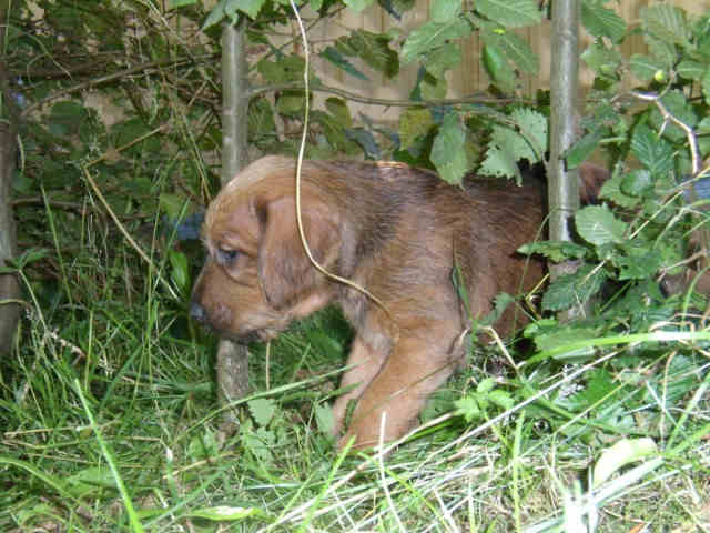 Mehrmals täglich dürfen die Welpen im Garten nach Belieben toben und die Umgebung unsicher machen. Natürlich werden ertse Futterschleppen gezogen und ein intensiver Kontakt zur Familie hergestellt.